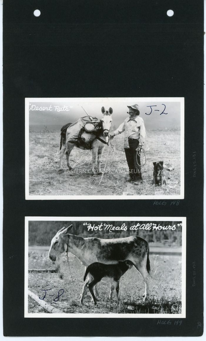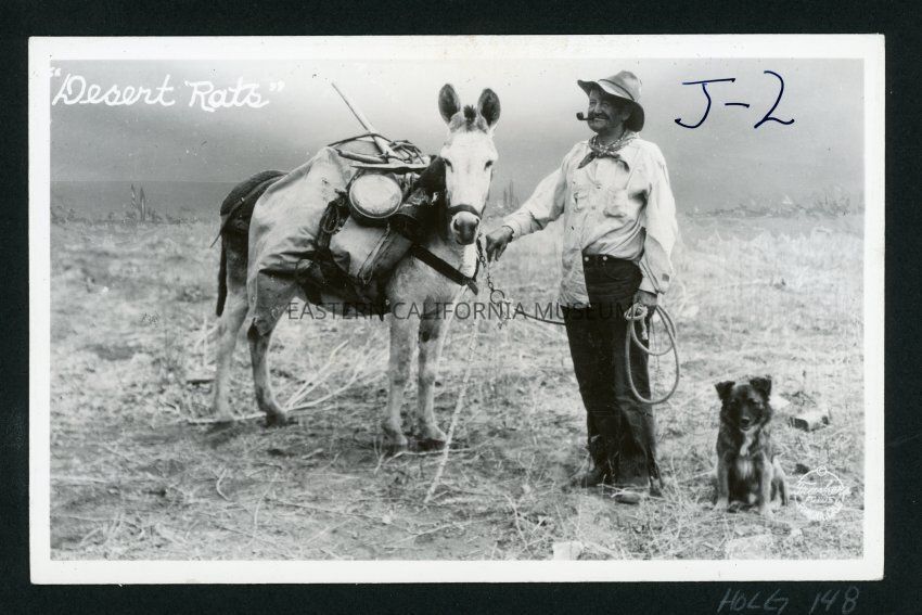 "Desert Rats" J2 Copyright Frashers Fotos Pomona Calif. This is a photo of an old desert prospector, his burro/mule/donkey, and a dog.