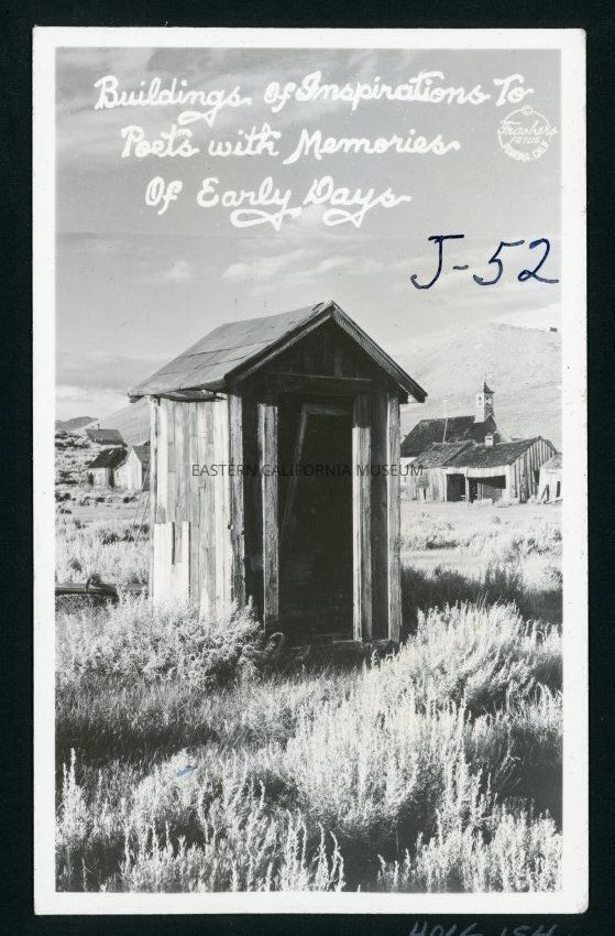 This is a photo of an outhouse with other structures in the background. Maybe Bodie?