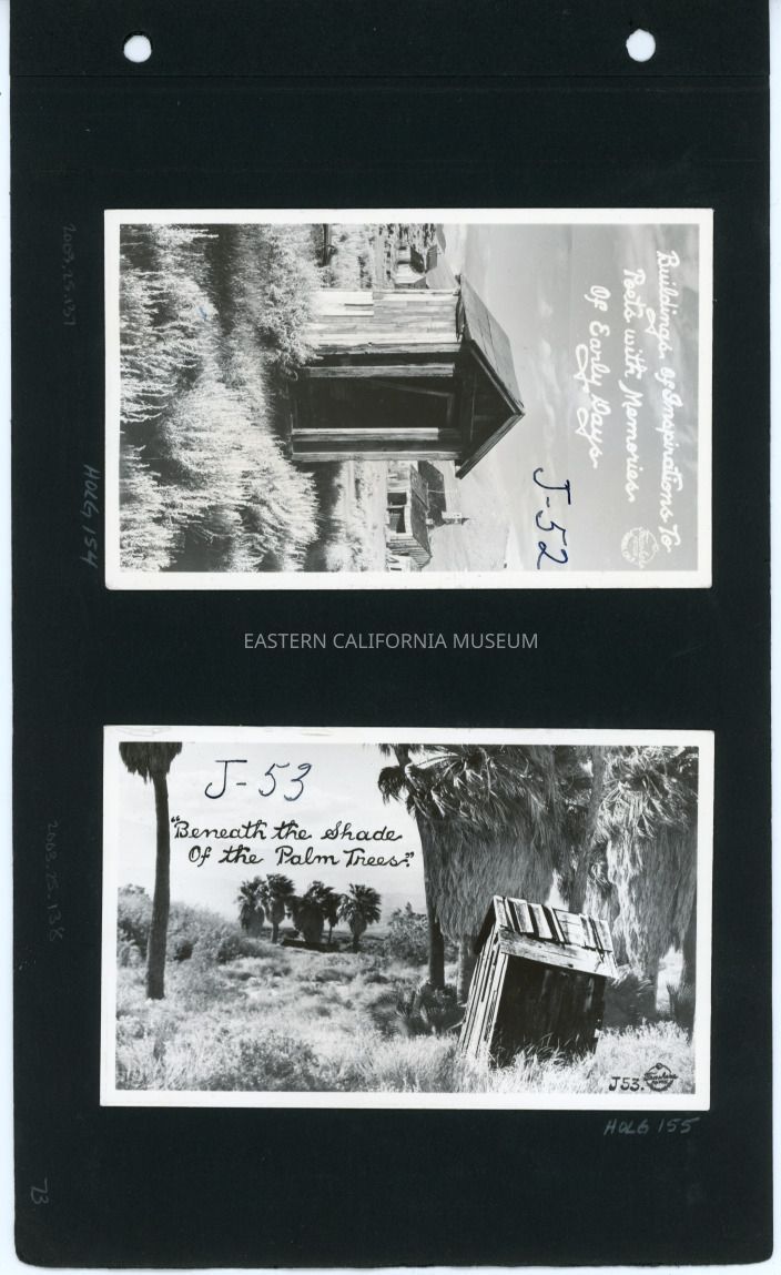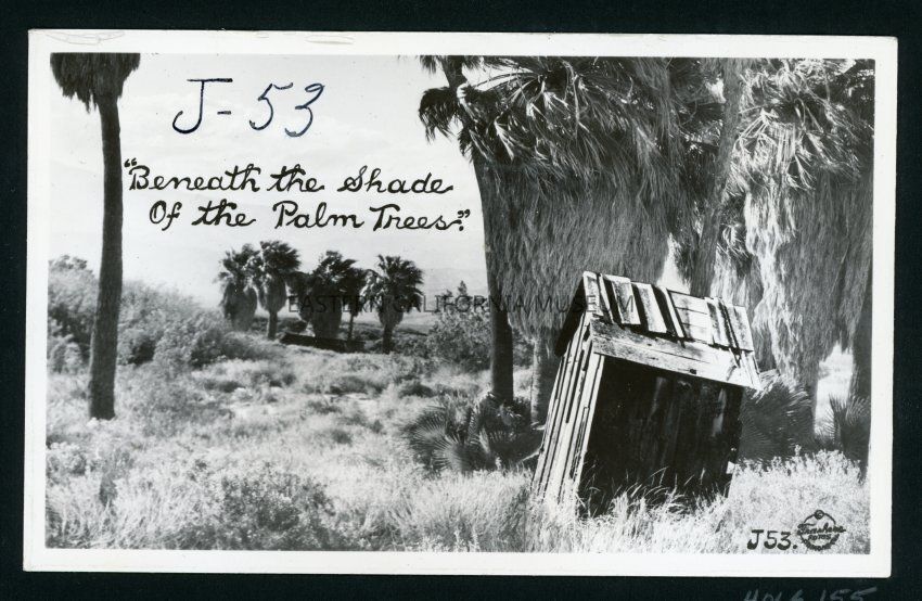 "Beneath the shade of the palm trees." J53 Copyright Frashers Fotos Pomona Calif. This is a photo of an outhouse and palm trees.