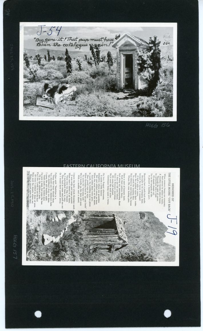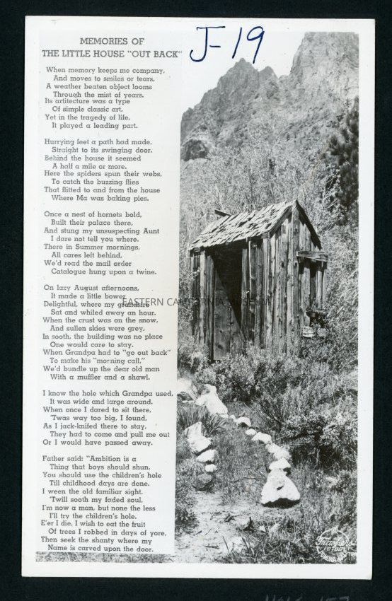 This is a photo of an outhouse with the full text of a poem beside it. Photo is detached from album page.