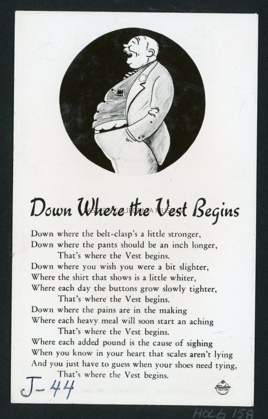 Down Where the Vest Begins J44 Copyright Frashers Fotos Pomona Calif. This is a postcard of an overweight cartoon man with a poem about gaining weight.