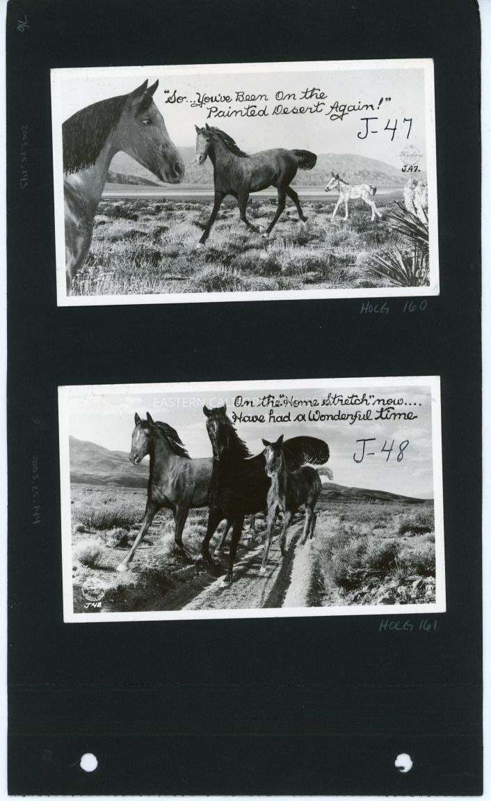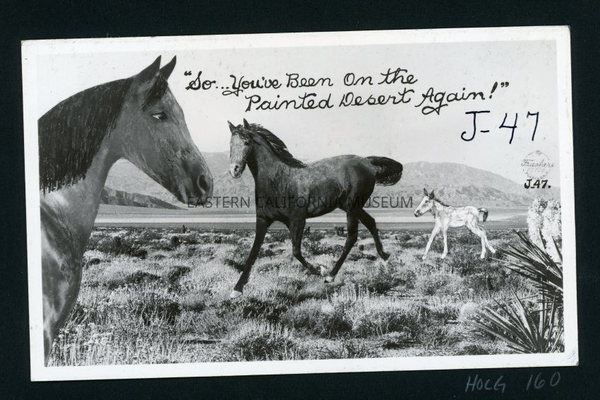 This is a composite image of three horses (drawn?) set against the background of a desert. The foal is white, in reference to the "painted desert."