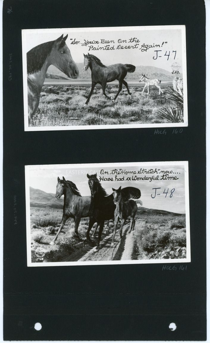 This is a composite image of three horses (drawn?) set against the background of a dirt road in the desert.