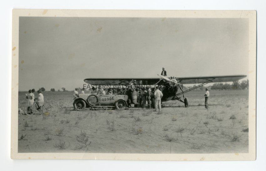 Photo of a vehicle parked beside an airplane. The car has "Independence Garage" painted on the side, and the plane is being used for the Civilian Pilot Training Program during WWII. One man appears to be handling a barrel--possibly refueling the plane? There are also three people [locals?] clustered around a bike to the left side of the photo.