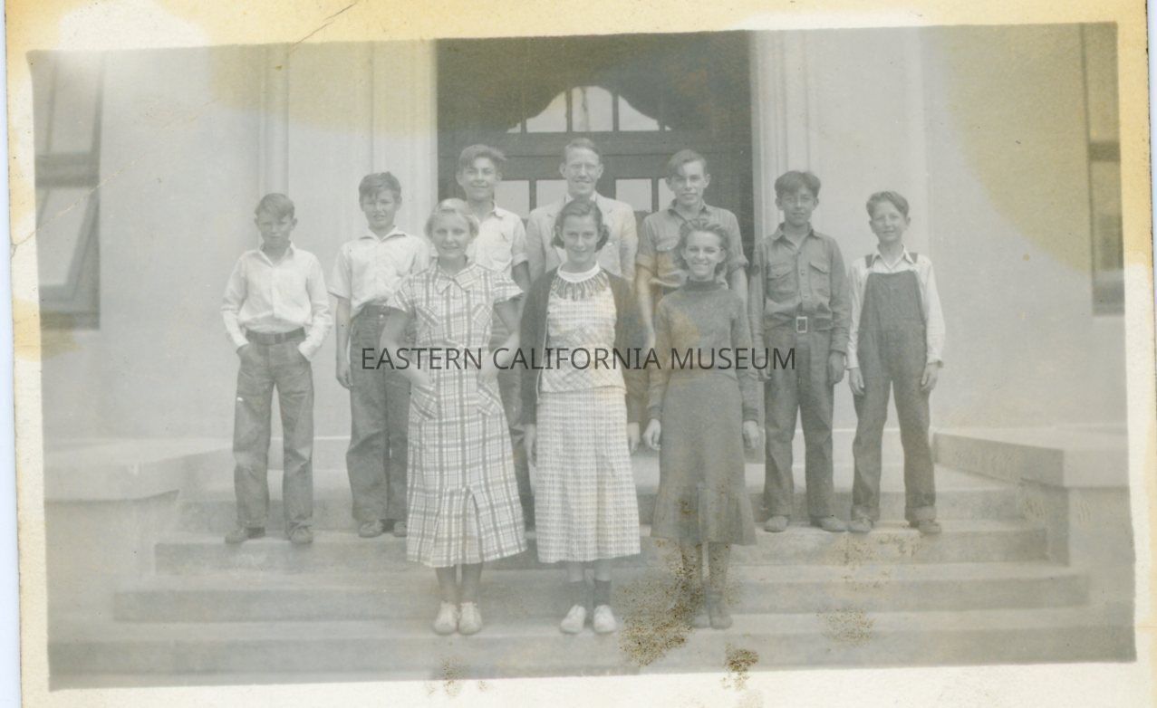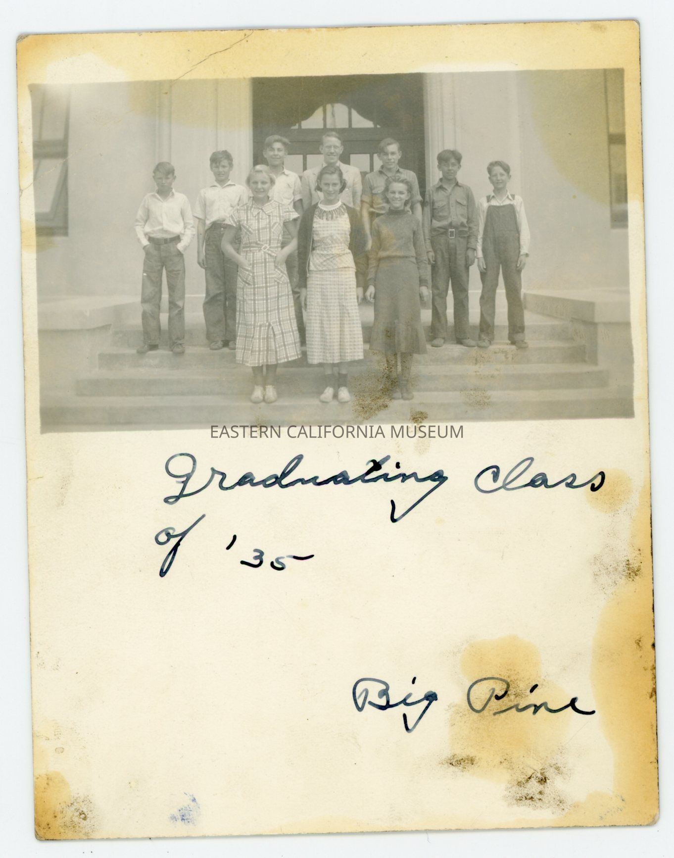 Photo of the Big Pine school graduating class of 1935. There are nine students and one teacher or principal standing on the steps in front of the high school building. They look a bit young to be graduating seniors, so perhaps this photo wasn't taken in the year 1935?