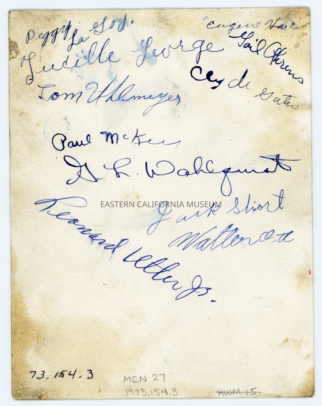 Written in pen on reverse are the signatures of the students: Gail Ahrens, Clyde Gates, Lucille George, Eugene Hartwell, Peggy LaGoy, Paul McKee, Walter Ott, Jack Short, Tom Uhlmeyer, Leonard Utter Jr., and G. [Gunnar] L. Wahlquist.Photograph Details
