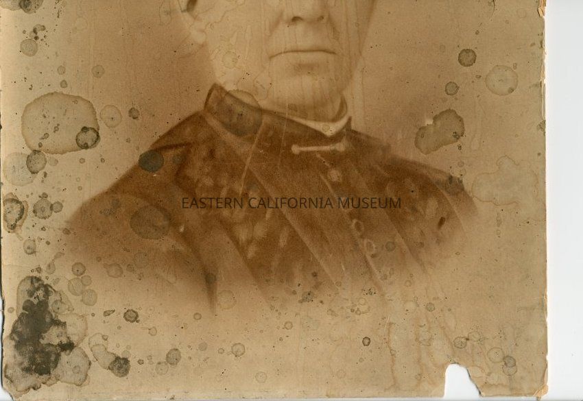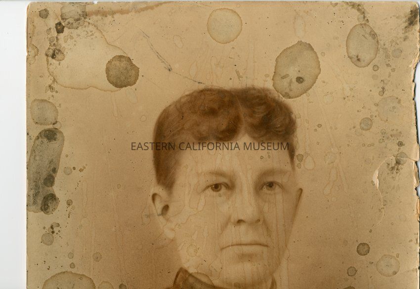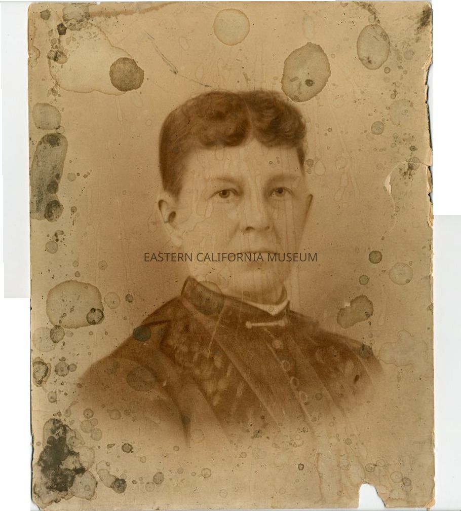 Mounted sepia tone photo of an unidentified woman from the bust up. The accession paperwork says that this photo came from a dairy in Bishop.