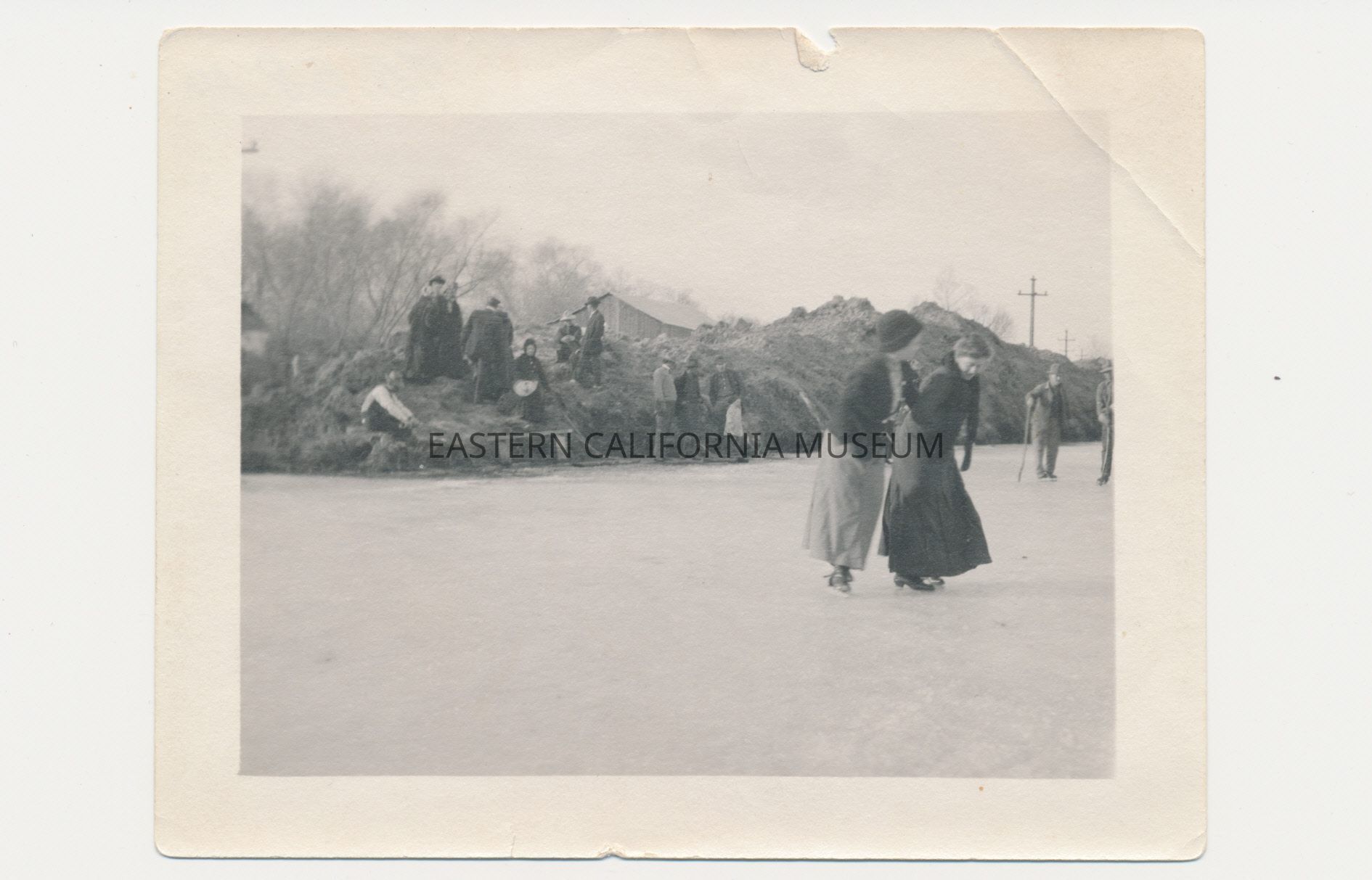 The accession paperwork says this was taken in 1916 when the aqueduct froze over, but the caption from the book "Mountains to Desert" identifies this a December 1913 skating party on the newly completed Los Angeles Aqueduct (near Manzanar). Another photo in the museum gives the date as Christmas 1911.Collection