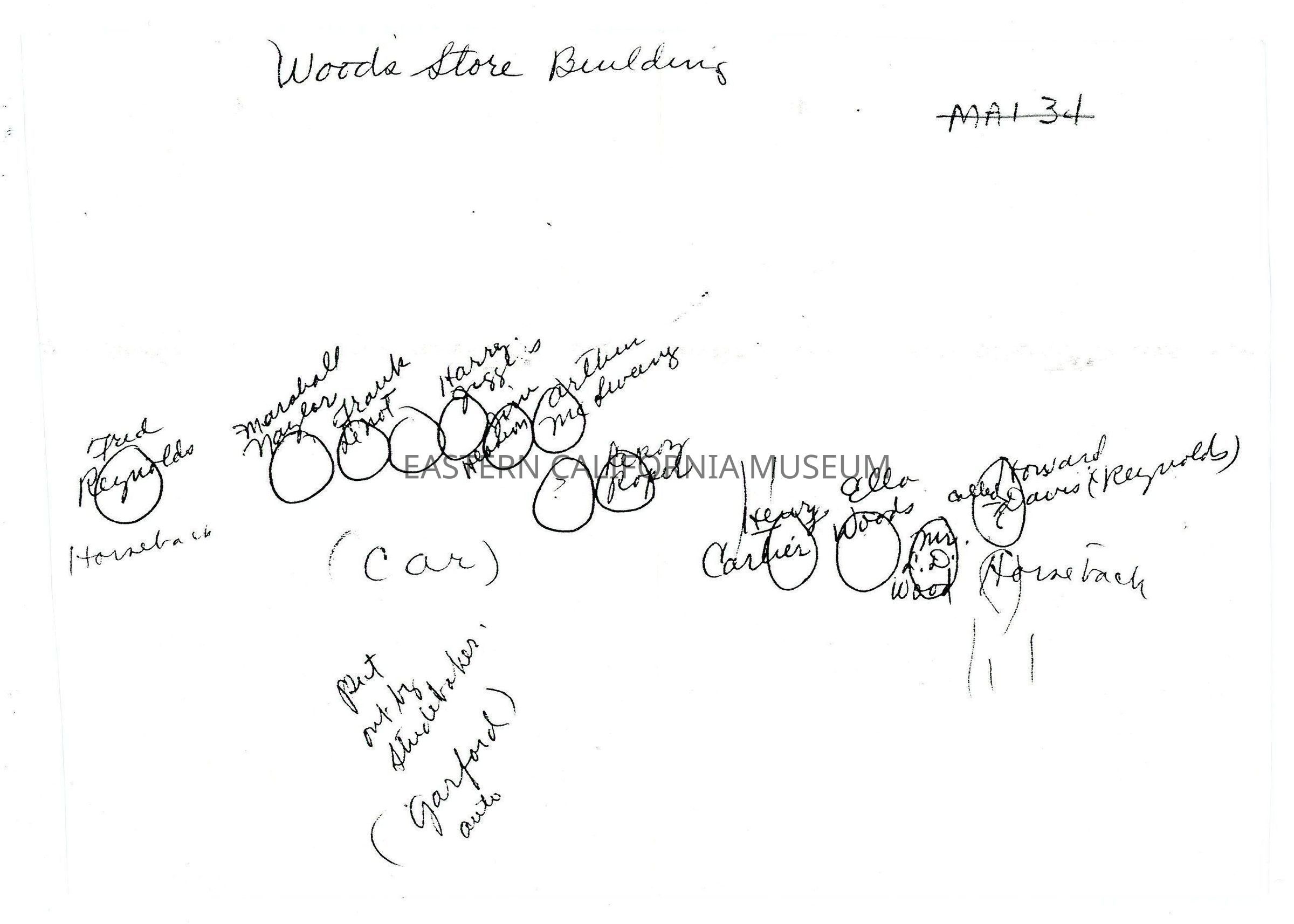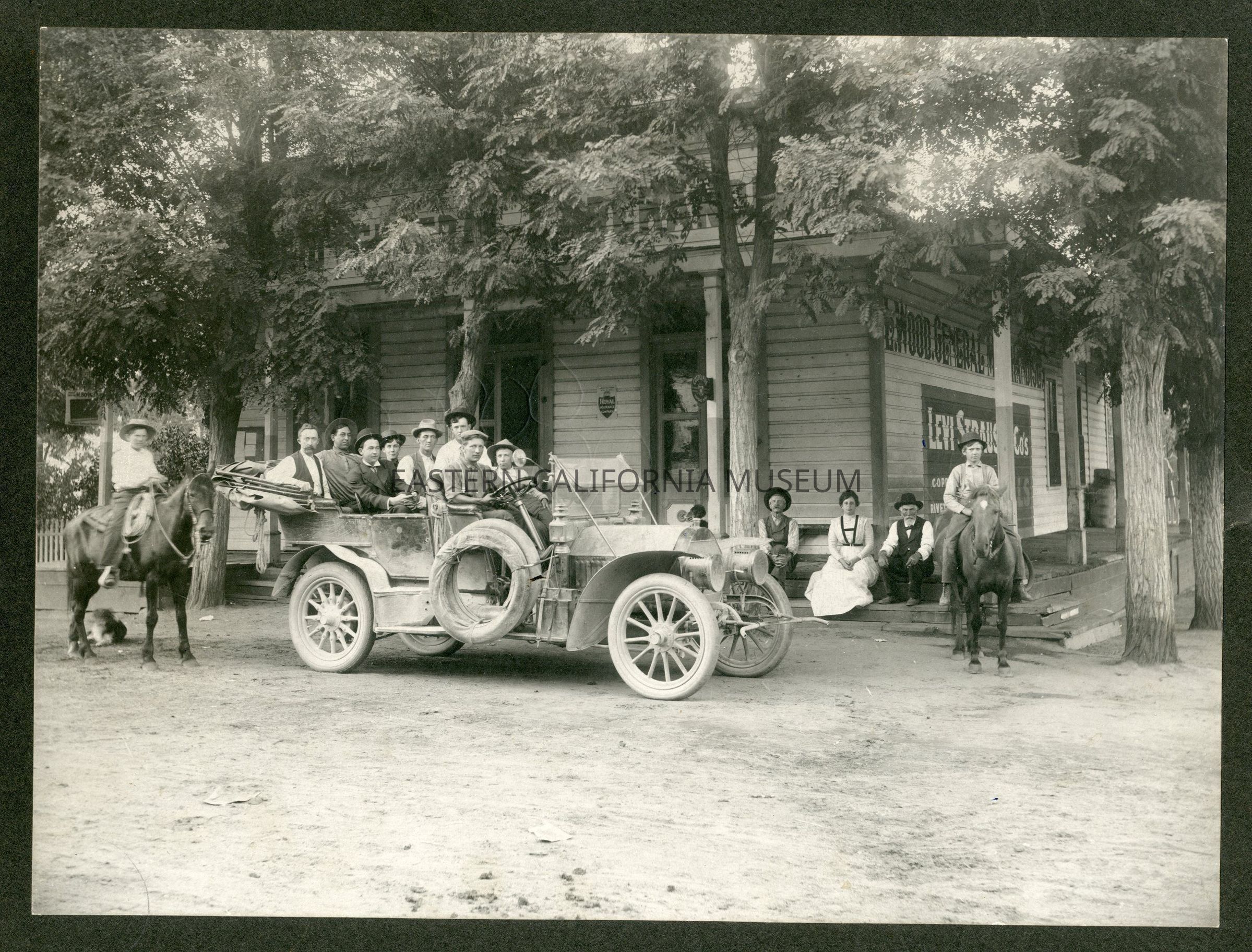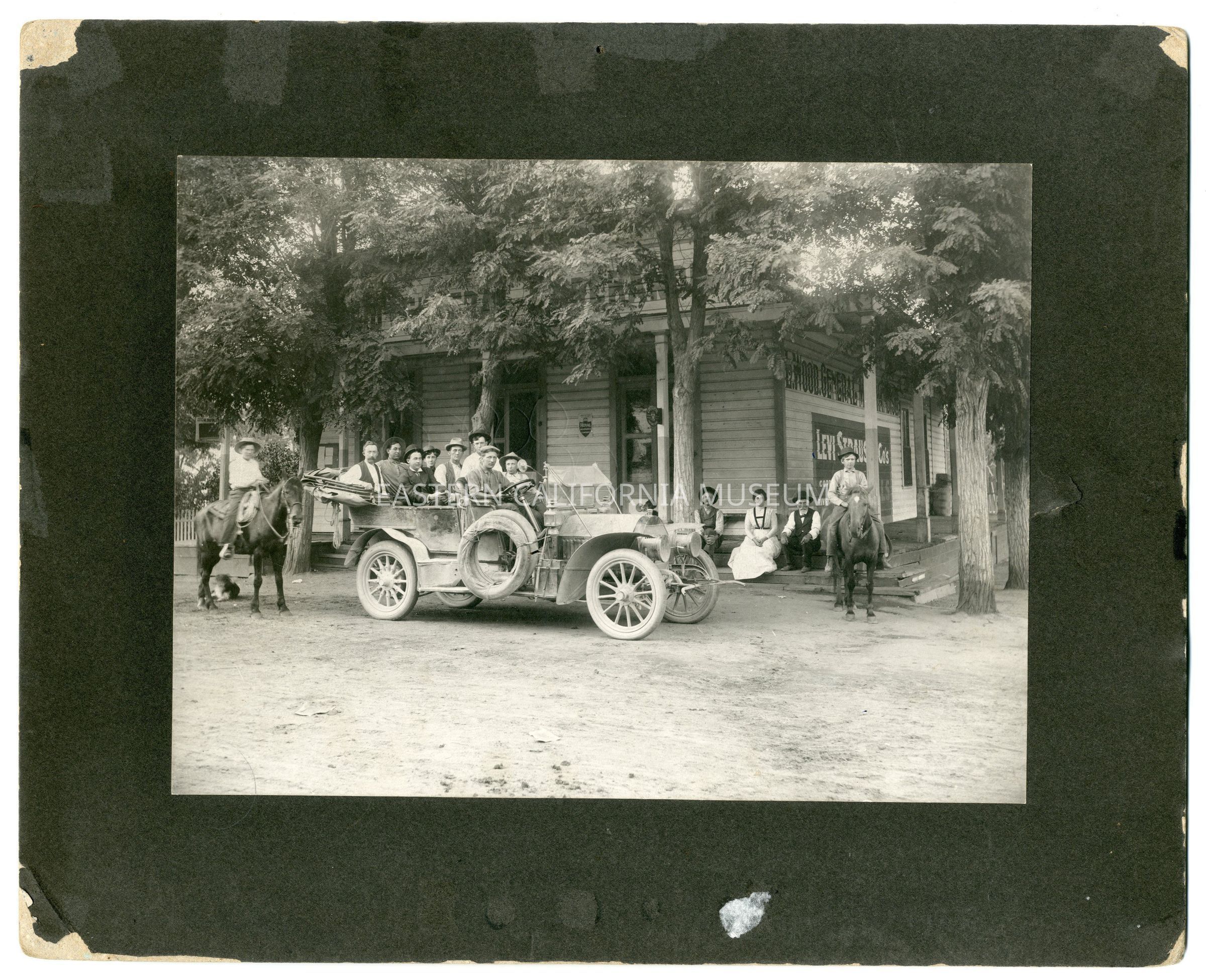 Mounted photo of the old Wood's Store in Independence with a vehicle parked in front of it. There are possibly eight people in the vehicle, three people sitting on the porch of the store, and two young boys on horseback. Painted on the right side of the building is "L. Wood General Merchandise" and below that is an advertisement for Levi Strauss Co.