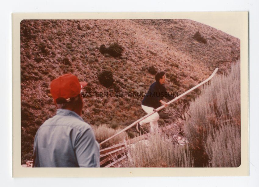 Color photo taken in 1974 in Nevada near Basalt at the site of a 10-stamp ore mill. Shows Mrs. Wilcox and Herschelle Hanson with Norwegian skis found at the site. The skis are now in the collection of the ECM (1973.130).