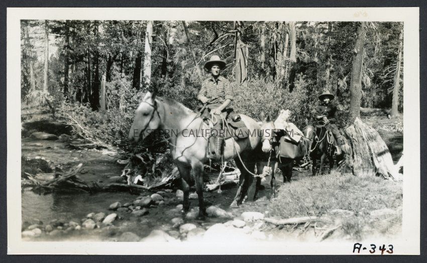 Photo is of two people crossing a creek on horseback with a dog on horseback between them. Likely Burton Frasher, his son (Burton Frasher Jr.), and the family dog.