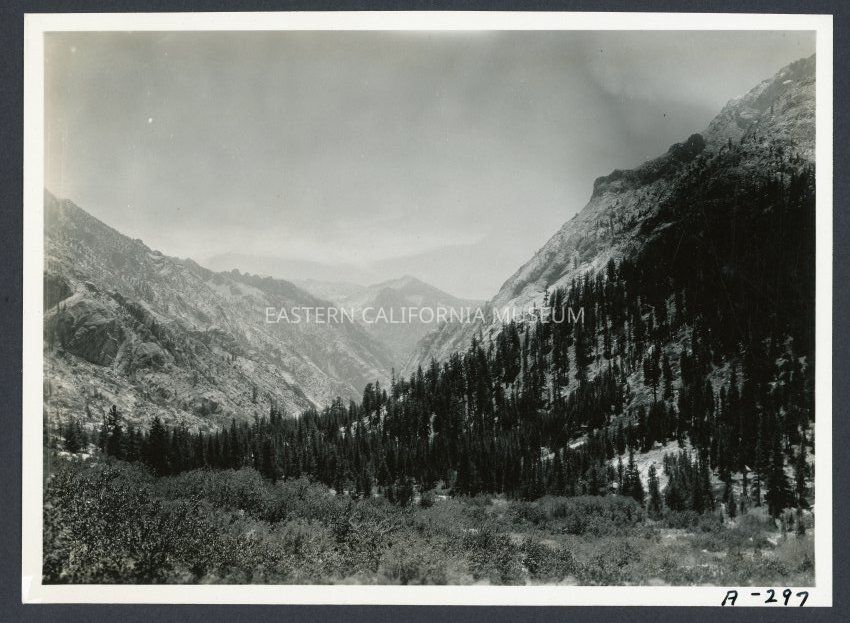 [No label] [No label] A-297 Photo is looking down a mountain hillside, maybe a canyon? Rocks, trees, shrubs.