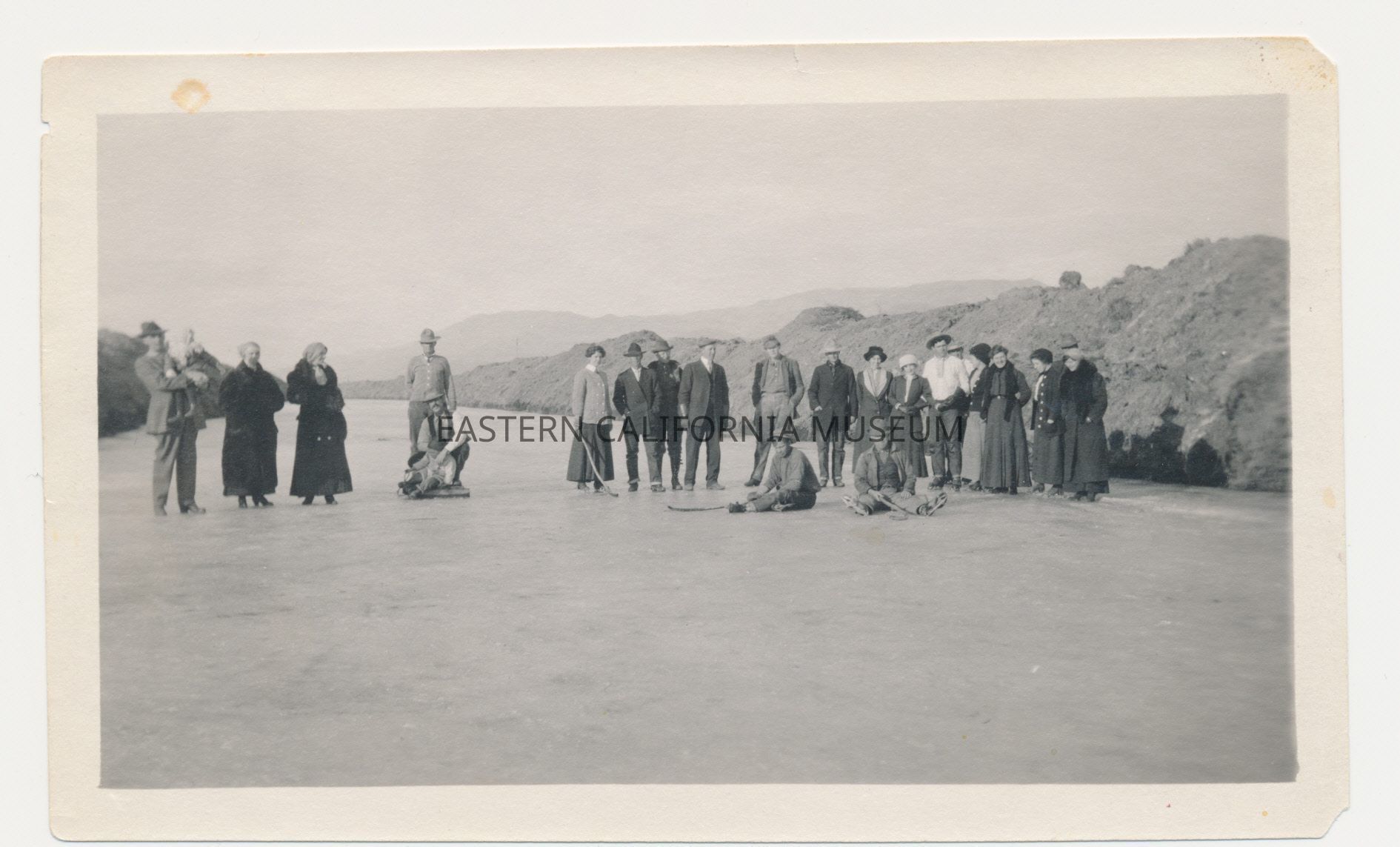 The accession paperwork says this was taken in 1916 when the aqueduct froze over, but the caption from the book "Mountains to Desert" identifies this a December 1913 skating party on the newly completed Los Angeles Aqueduct (near Manzanar). Another photo in the museum gives the date as Christmas 1911.Collection