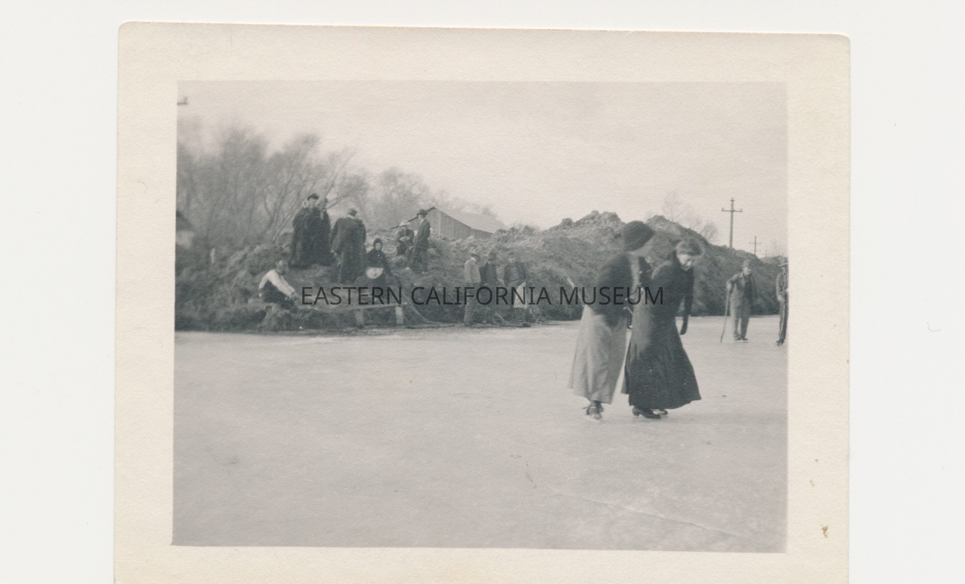 The accession paperwork says this was taken in 1916 when the aqueduct froze over, but the caption from the book "Mountains to Desert" identifies this a December 1913 skating party on the newly completed Los Angeles Aqueduct (near Manzanar). Another photo in the museum gives the date as Christmas 1911.Collection