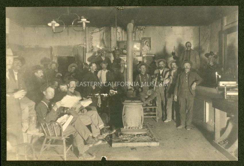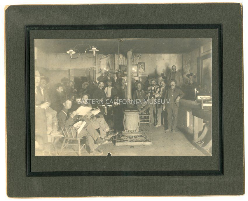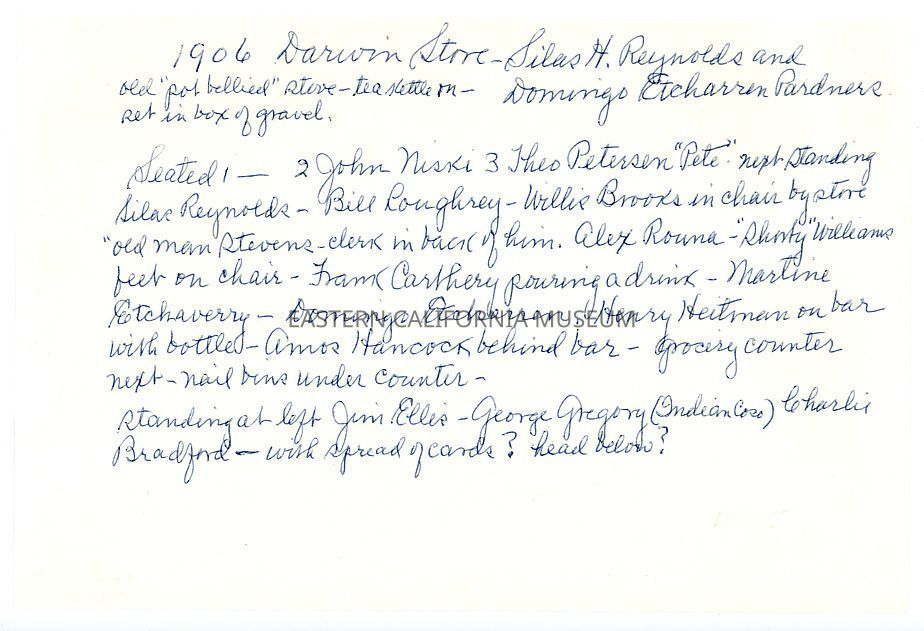 Handwritten on sheet of paper taped to reverse: 1906 Darwin Store. Silas H. Reynolds and Domingo Etcharren partners. Old "pot bellied" stove--tea kettle on--set in box of gravel. Seated: 1. [unknown], 2. John Niski, 3. Theo Peterson [Petersen?] "Pete", next standing Silas Reynolds, Bill Loughrey, Willis Brooks in chair by store, "old man" Stevens--clerk in back of him, Alex Rouna, "Shorty" Williams feet on chair, Frank Carthery pouring a drink, Martine Etchaverry, Domingo Etcharren, Henry Heitman on bar with bottle, Amos Hancock behind bar, grocery countery next, nail bins under counter. Standing at left Jim Ellis, George Gregory (Indian Coso), Charlie Bradford, with spread of cards? head below?