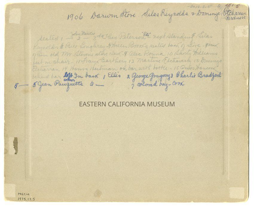 Handwritten on reverse: 1906 Darwin Store. Silas Reynolds an Domingo Etcharren partners. Seated 1. [unknown], 2. John Niski, 3. Theo Peterson [Petersen?] "Pete", next standing 5. Silas Reynolds, 6. Bill Loughrey, 7. Willis Brooks seated back of store, 8. back of him old Mr. Stevens store clerk, 9. Alec Rouna, 10. Shorty Williams feet in chair, 11. Frank Carthery, 12. Martine Etchaverry, 13. Domingo Etcharren, 14. Henry Heitman on bar with bottle, 15. Amos Hancock behind bar left corner. In back 1. Ellis, 2. George Gregory, 3. Charlie Bradford, 4. [unknown], 5. Jean Pauquette, 6. [unknown], 7. Colored boy--cook.