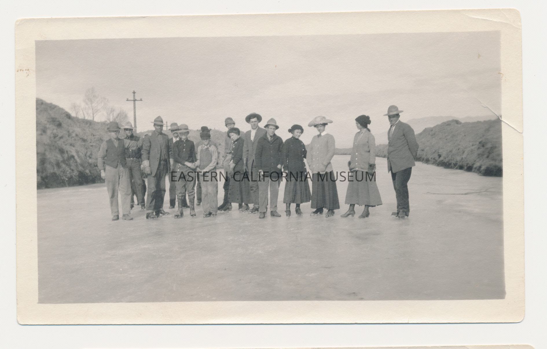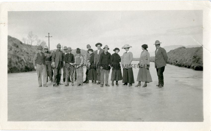 The accession paperwork says this was taken in 1916 when the aqueduct froze over, but the caption from the book "Mountains to Desert" identifies this a December 1913 skating party on the newly completed Los Angeles Aqueduct (near Manzanar). Another photo in the museum gives the date as Christmas 1911.Collection
