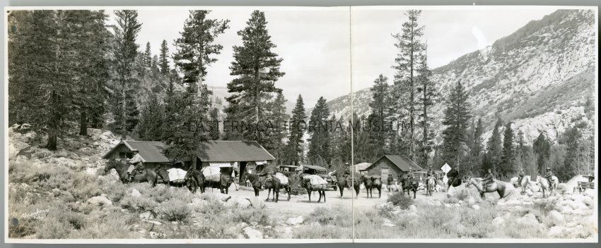 Photo is of a pack train loaded up and ready to head out. Cabins, structures, vehicles, people, horses, mules, trees visible.