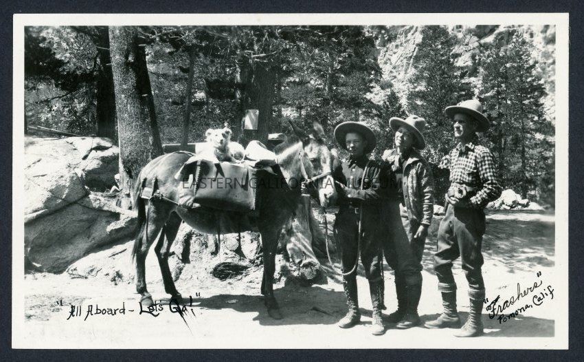 "All Aboard--Let's Go!" Frashers Pomona Calif. [No number] The photo is of three people (the Frasher family) and their family dog sitting on a mule.