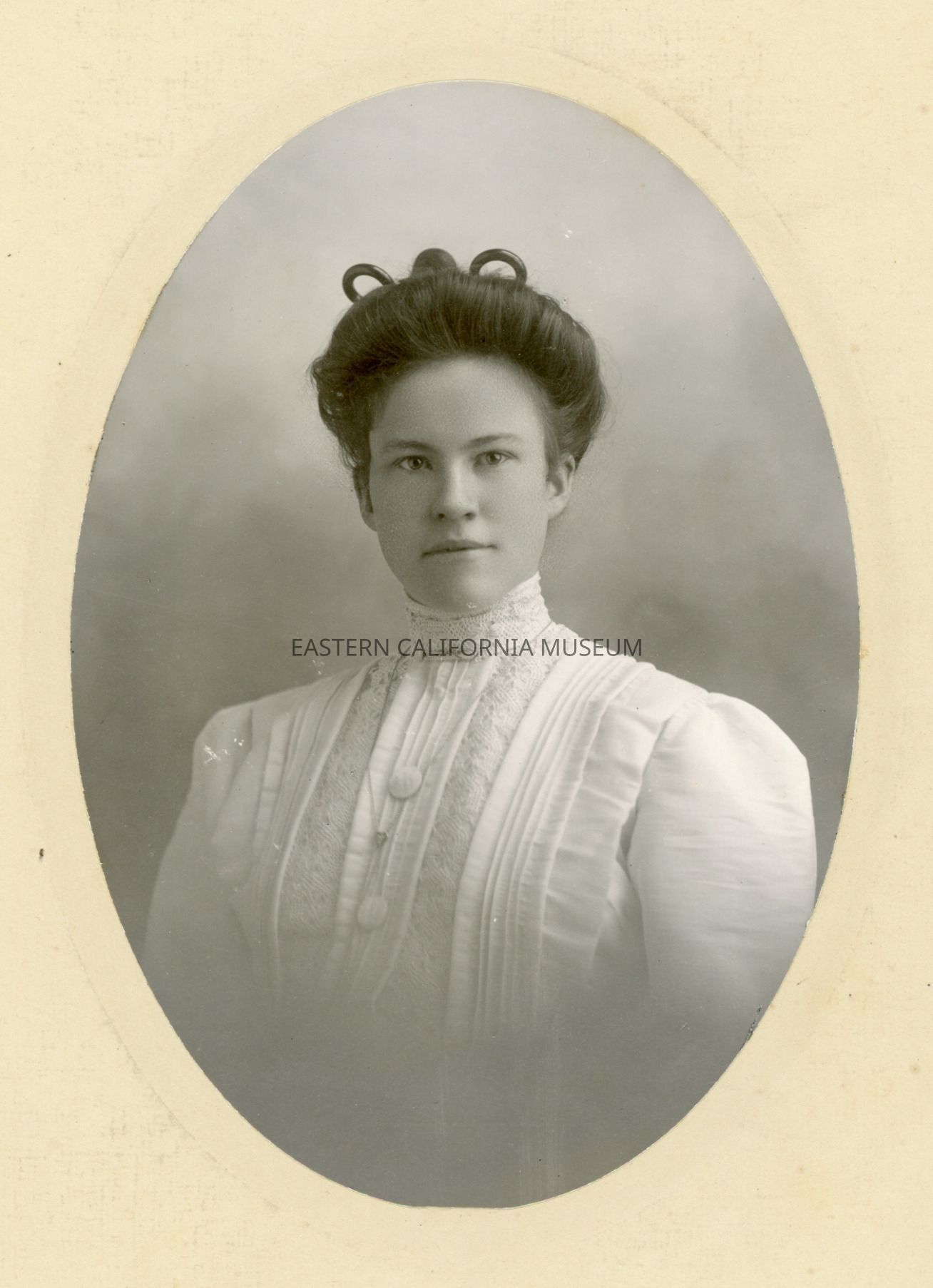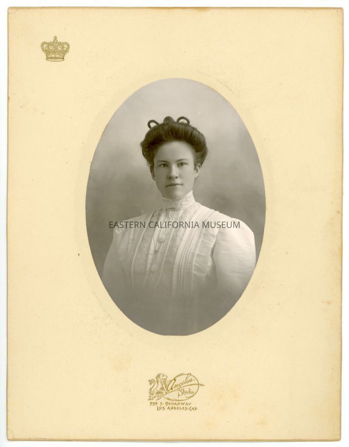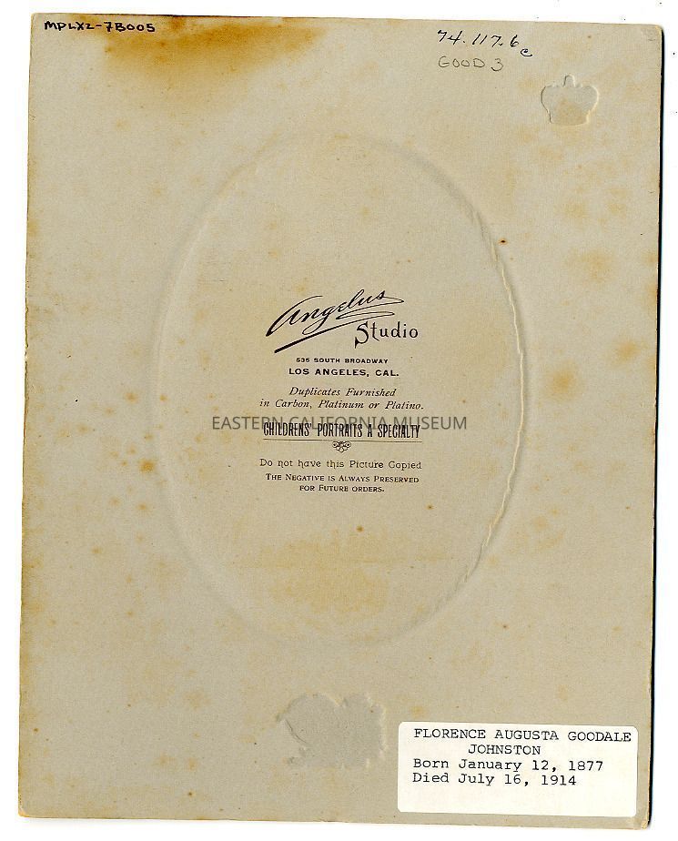 Mounted studio portrait of a young woman identified on the reverse as Florence Augusta Goodale Johnston. She was born January 12, 1877 and died July 16, 1914. Photorapher or studio was Angelus Studio of Los Angeles.Collection