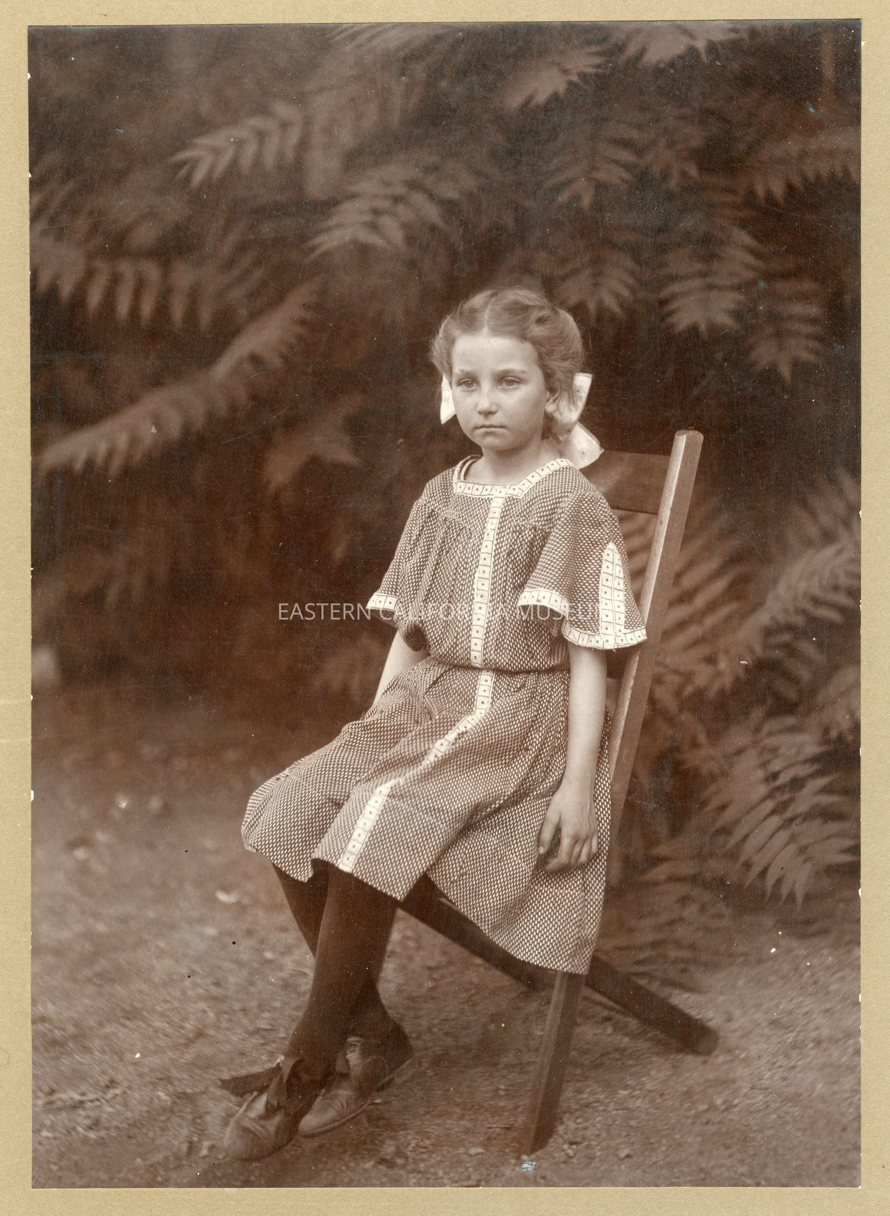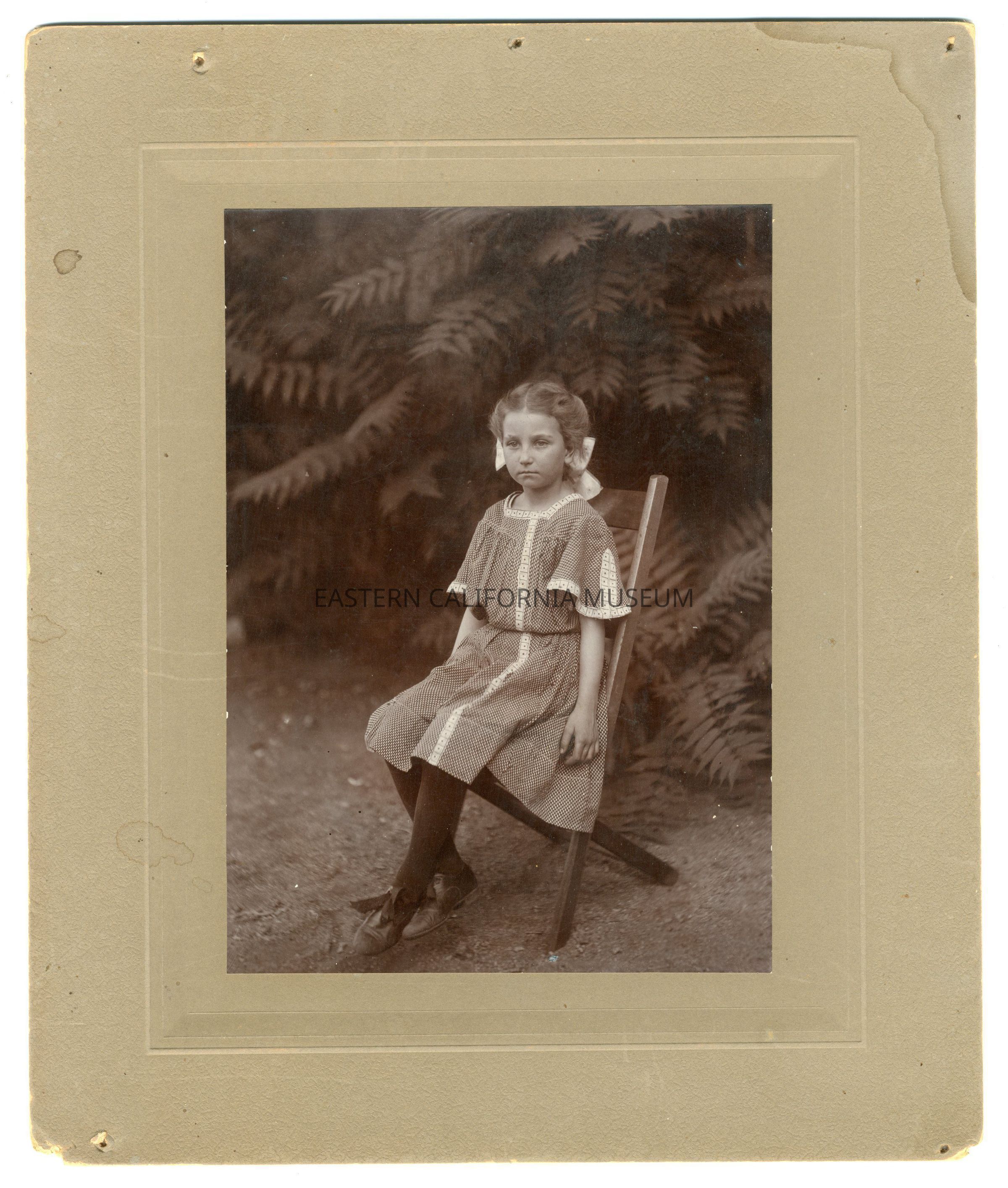 Mounted photo of Norma Fausel as a young girl. She is sitting on a wooden folding chair outside.