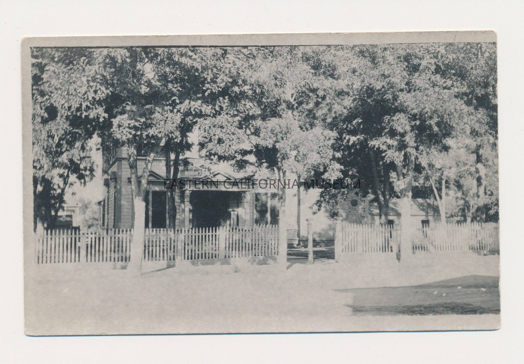 Photo postcard of the third Inyo County Courthouse. The jail or archive room is the stone building to the right.