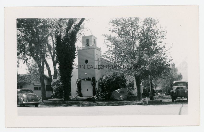 Photo of the Pioneer Memorial Methodist Church in Independence circa the 1930s. There are two vehicles parked beside it and a large stone with a plaque near the corner of the intersecting streets.