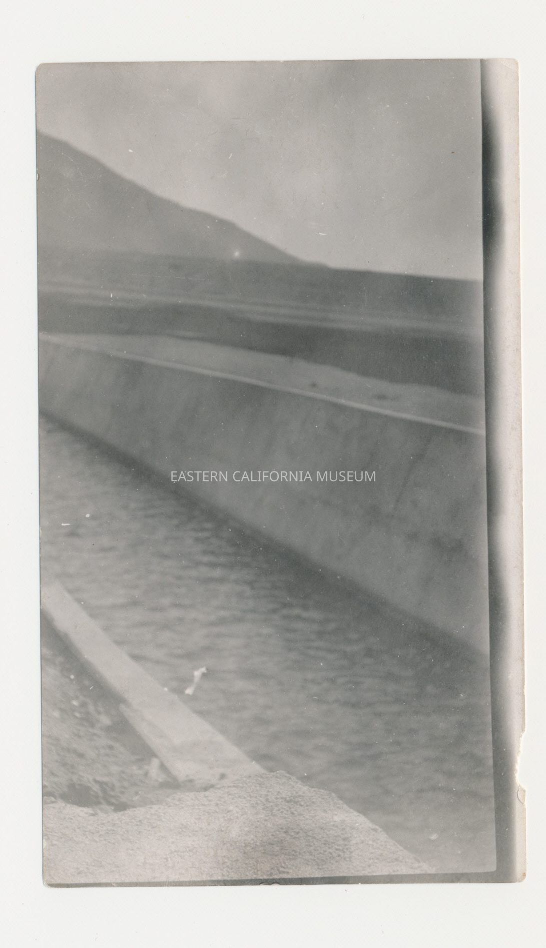 Close-up photo of an open, lined section of the L.A. Aqueduct near Cottonwood Power Plant. There is a small amount of water in the channel. The location is the Olancha Division of the Aqueduct Project.Collection