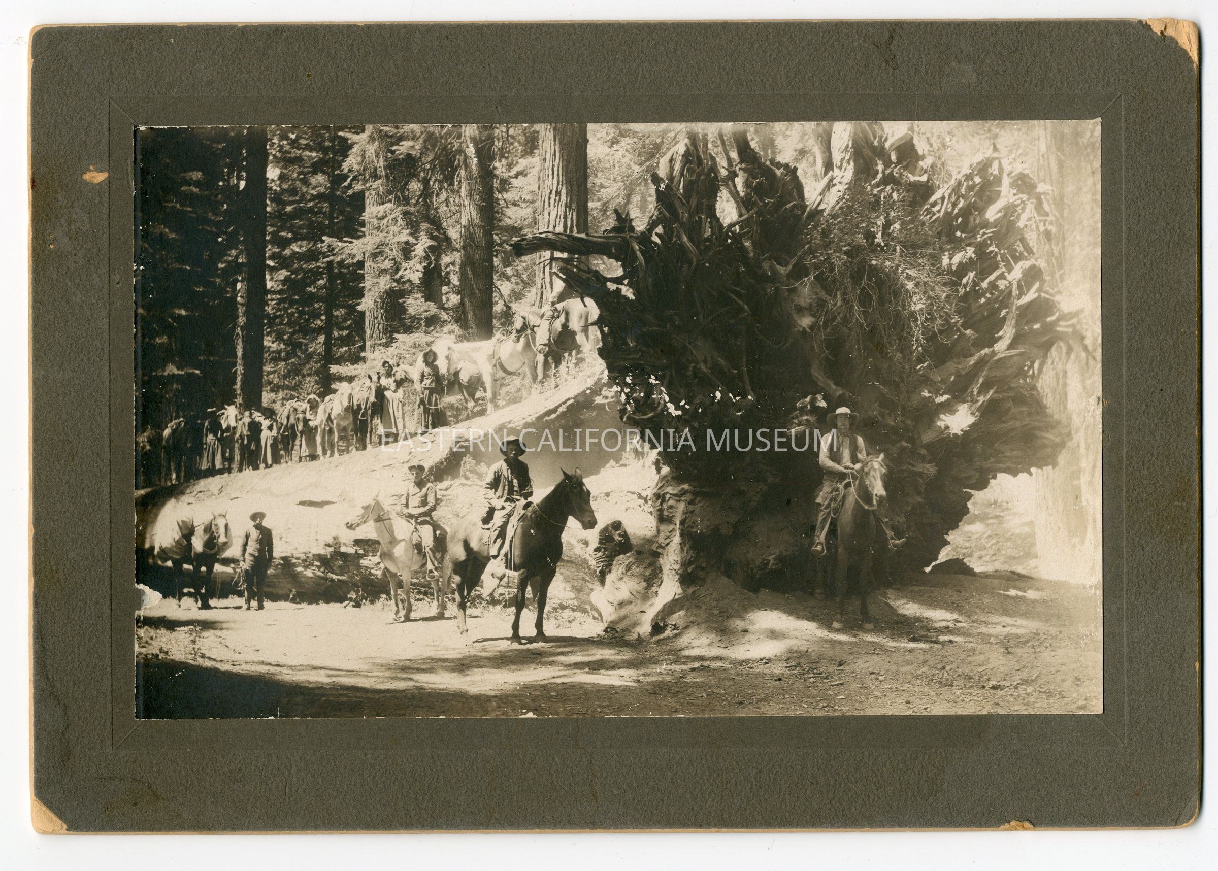 Mounted photo of many people with horses standing on and in front of a massive fallen sequoia. Notes on the archival envelope identify the location as Yosemite National Park, Elizabeth and John Bodle are among the people, and that it was taken on 07/12/1893.