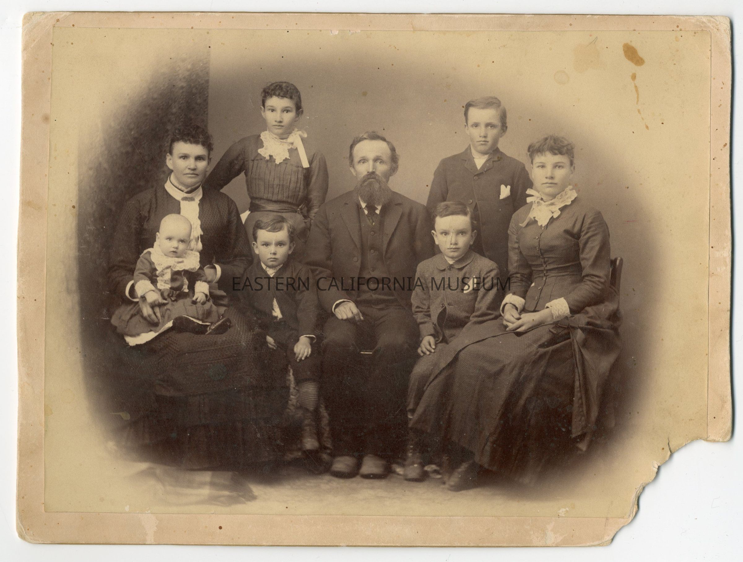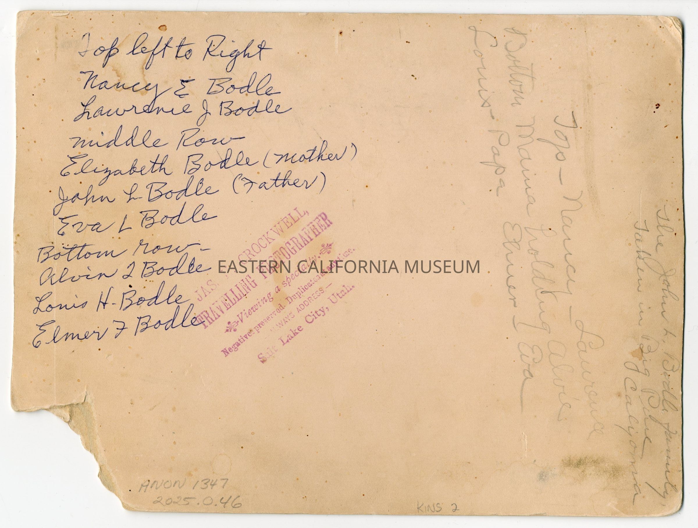 Written in pencil on reverse: The John L. Bodle family. Taken in Big Pine, California. Top: Nancy, Laurence. Bottom: Maina holding Alvie, Louis, Papa, Elmer, Eva.