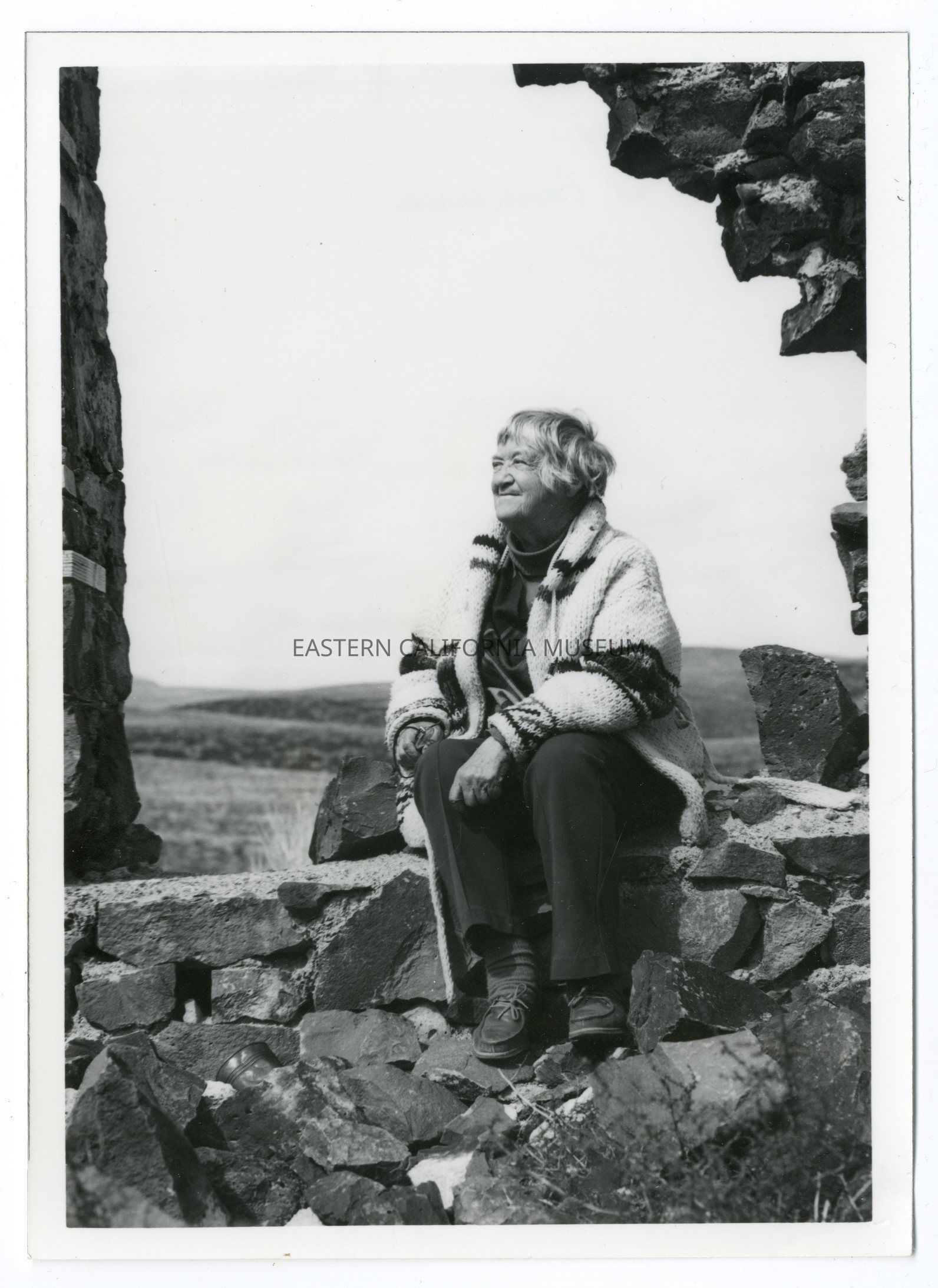 Photograph of Evelyn Eaton sitting on a stone wall.