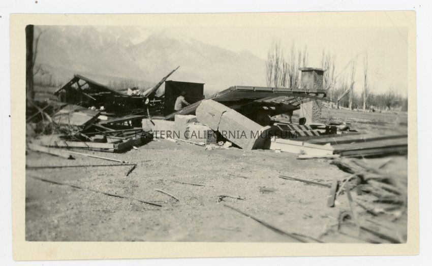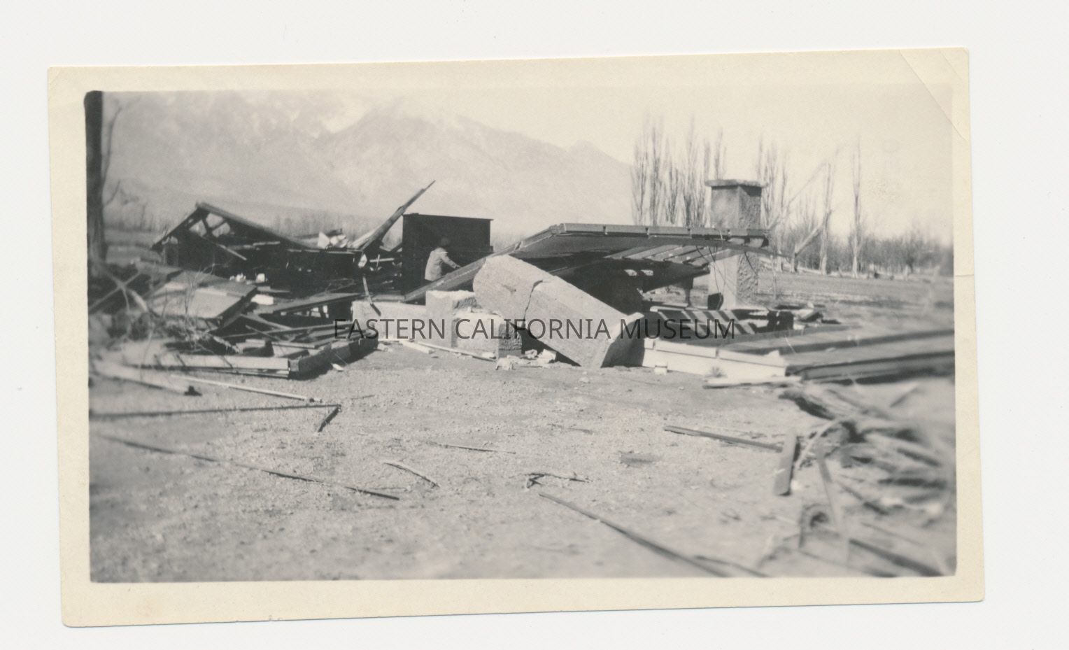 Photo of a completely demolished building. This is one of six photos of damage caused by a wind storm, likely in 1923. There is a small child by the piano, likely Buddy Asher.