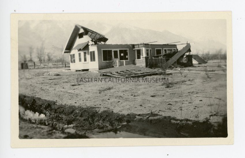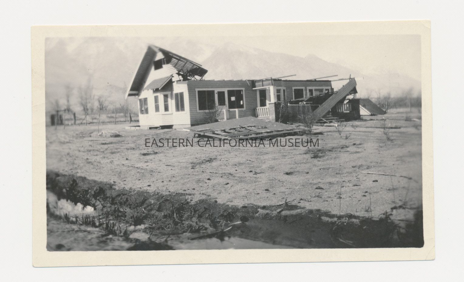 Photo of a house with extensive damage. The roof is almost completely blown off. This is one of six photos of damage caused by a wind storm, likely in 1923.