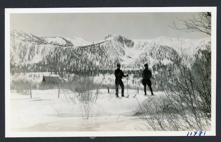 Photo is of two people cross-country skiing with snow everywhere and building, mountain in background.