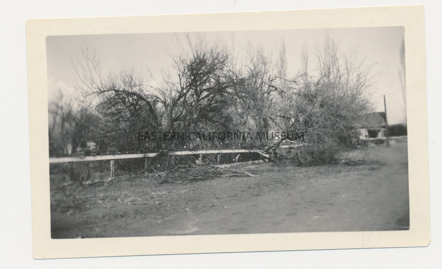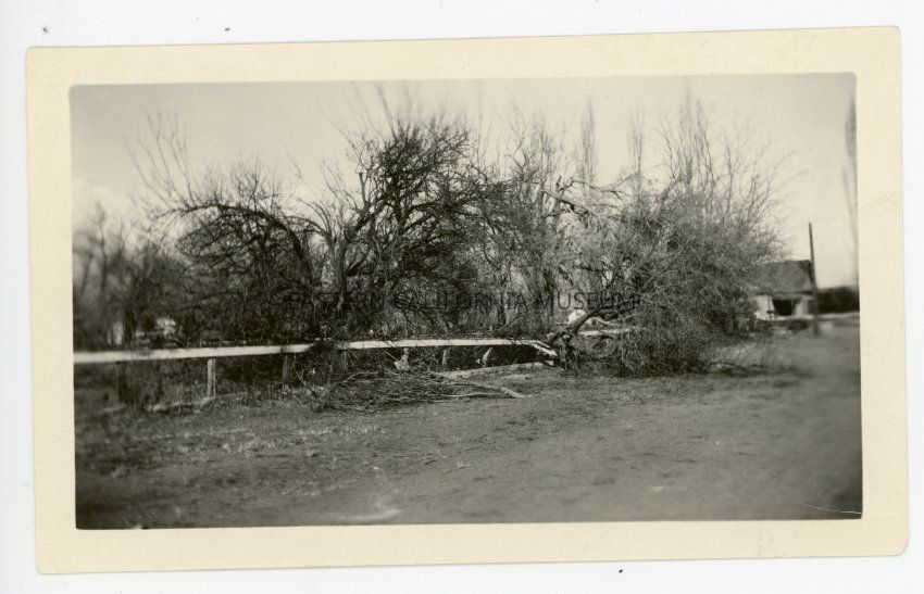 Photo of fallen trees that broke a fence or guard rail. Dirt road in foreground, house in background. This is one of six photos of damage caused by a wind storm, likely in 1923.