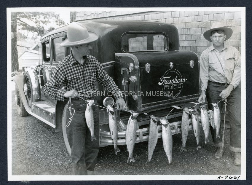 Photo is of two men (Burton Frasher on left?) holding a stringer of fish. Frasher's vehicle is their backdrop. Possibly in front of the June Lodge in June Lake?