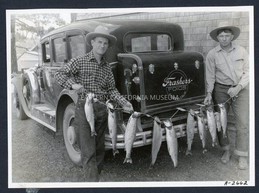Photo is of two men (Burton Frasher on left?) holding a stringer of fish. Frasher's vehicle is their backdrop. Possibly in front of the June Lodge in June Lake?