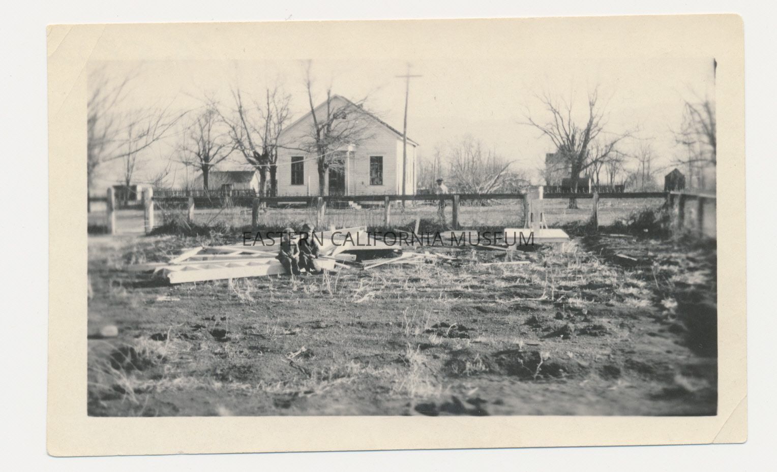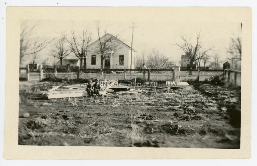 Photo of two children sitting on the remains of a house or structure in a field. This is one of six photos of damage caused by a wind storm, likely in 1923.