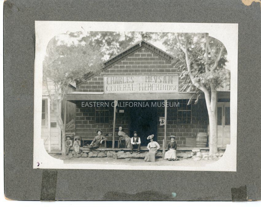 Mounted photo of the Charles Meysan General Merchandise store in Lone Pine with seven people sitting on front porch. There is an advertisement for Gen W. Childs Cigars next to doorway. In lower left corner of photo the number 3 has been written in black ink.