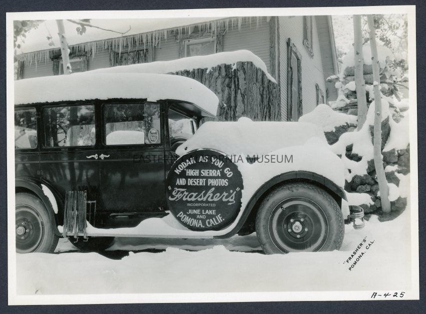 The sign on the side of the vehicle says "Kodak As You Go 'High Sierra' and Desert Photos Frasher's June Lake and Pomona, Calif."