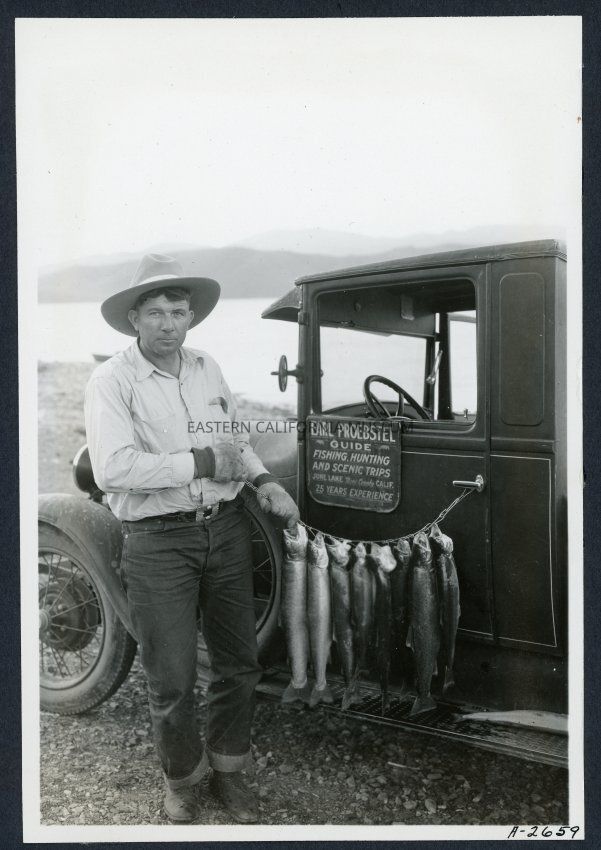 Photo is of a man (likely Earl Proebstel) posing with a string of fish beside his vehicle. There is a lake visible in background. The sign on the side of the vehicle says "Earl Proebstel Guide Fishing Hunting and Scenic Trips June Lake Mono County Calif. 25 Years Experience."