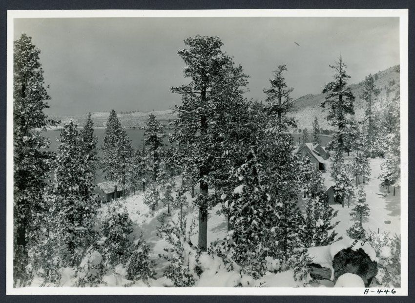 [No label, but it is described in the inventory as "Lake and cabins winter."] Frashers Pomona Cal. A-446
