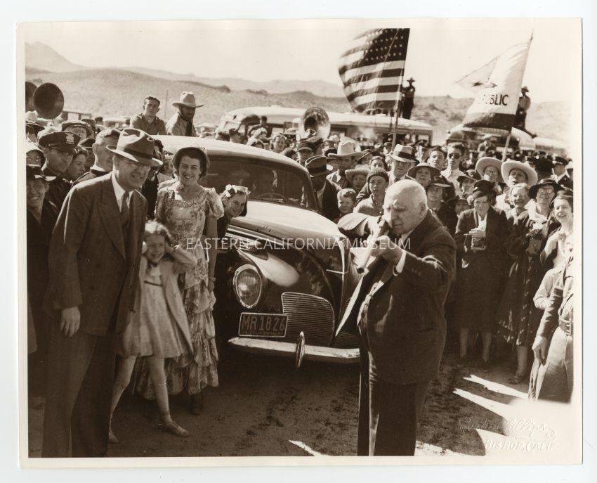 Additional information: After receiving a telegraph message from President Franklin D. Roosevelt giving the OK, California State Governor Frank Merriam opened the new highway in true western style by “cutting the ribbon” with a blast from a shotgun. With the highway officially open, the Lincoln Zephyr raced off toward Panamint Valley with hundreds of cars following behind.