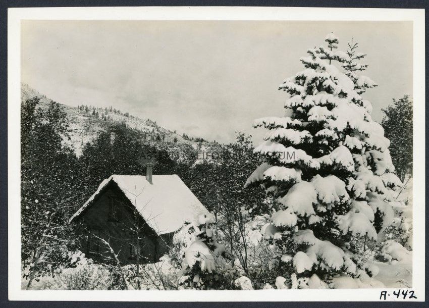 [No label, but it is described in the inventory as "Cabin in snow."] Frasher's Pomona Cal. A-442