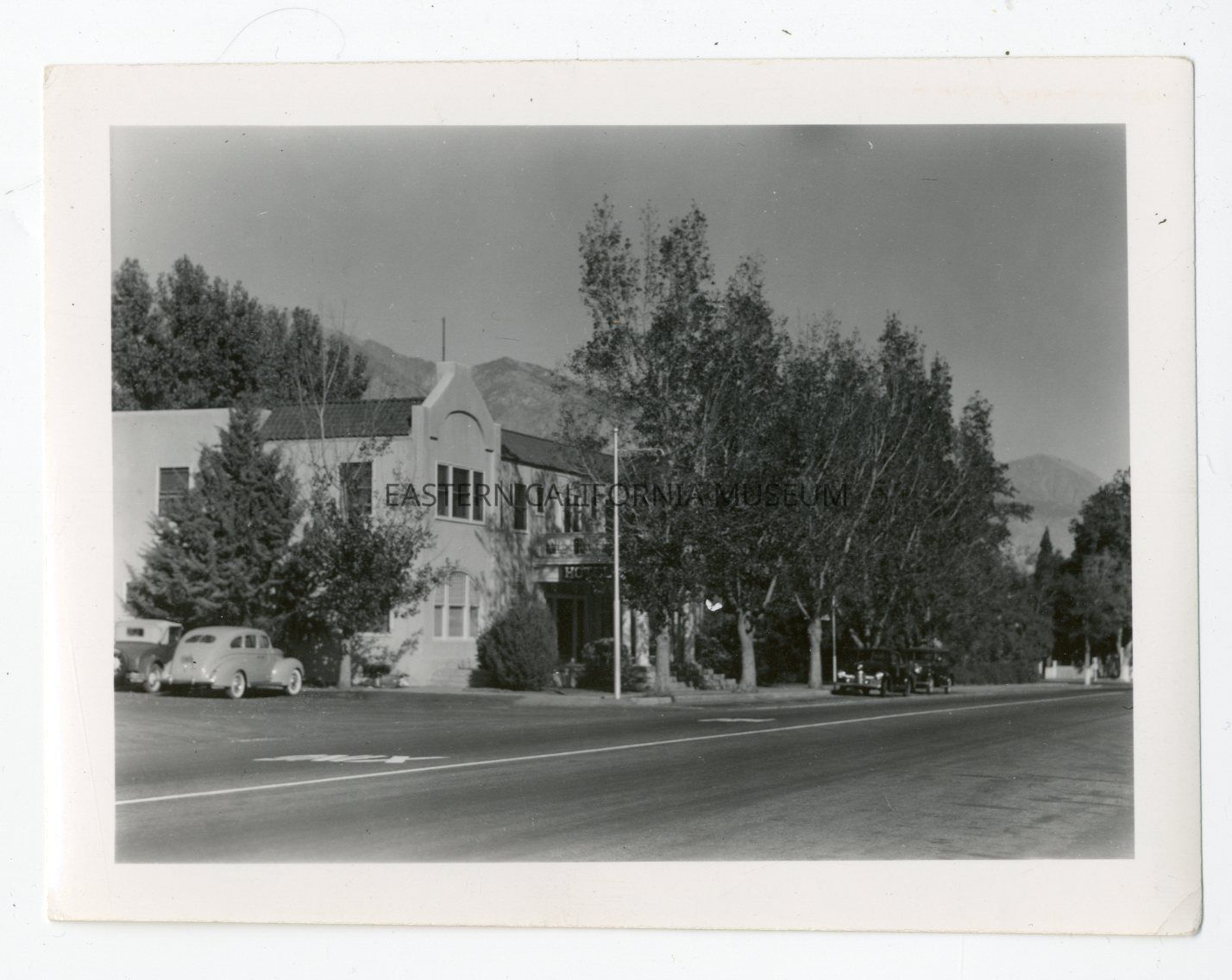 Photo of the Winnedumah Hotel in Independence taken from the SE looking NW. There are a few automobiles parked in front of and on the side of the hotel.