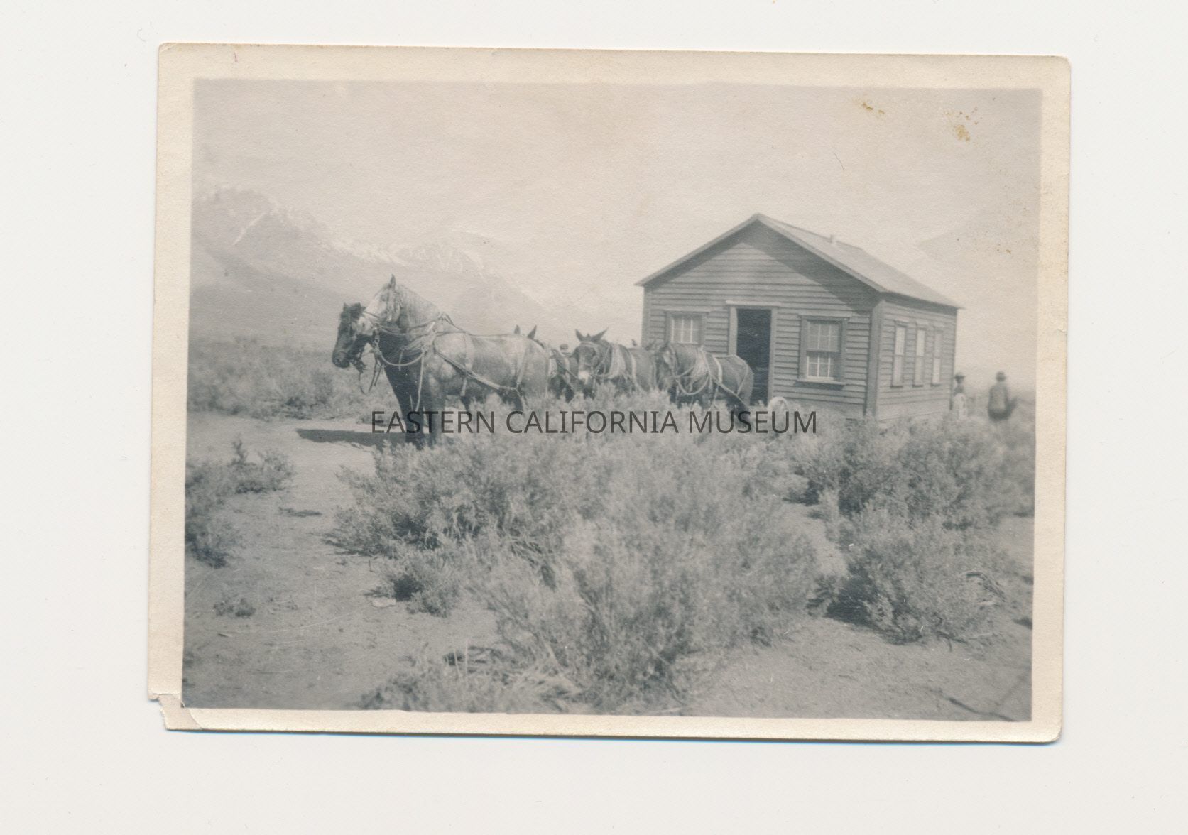Photo of a 6-horse team hauling a house to aqueduct construction camp #4 in the spring of 1910. There appear to be one or two people behind the house.Collection
