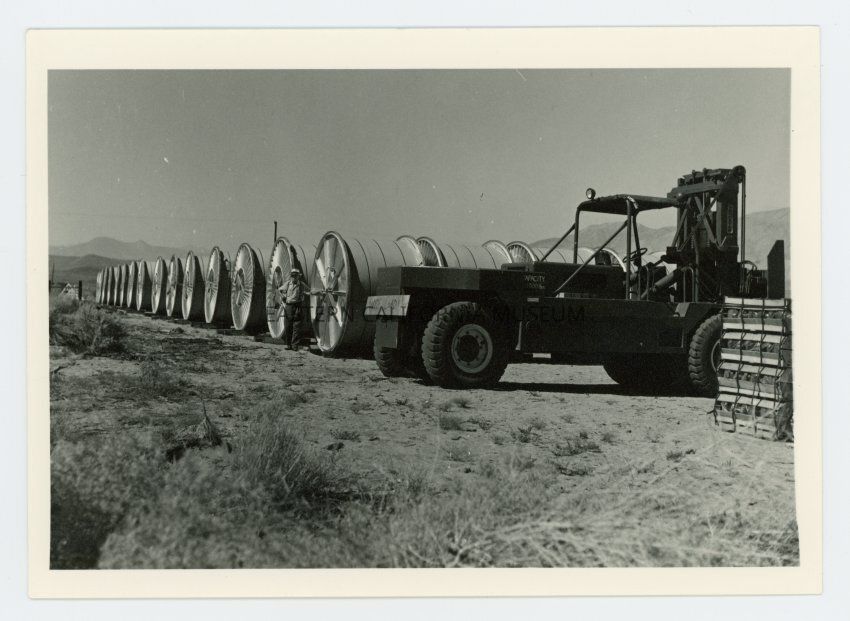 Photo of a long row of direct current cable reels used on LADWP transmission line project around Aberdeen. It may be a more contemporary image given the fork lift and quality of print.