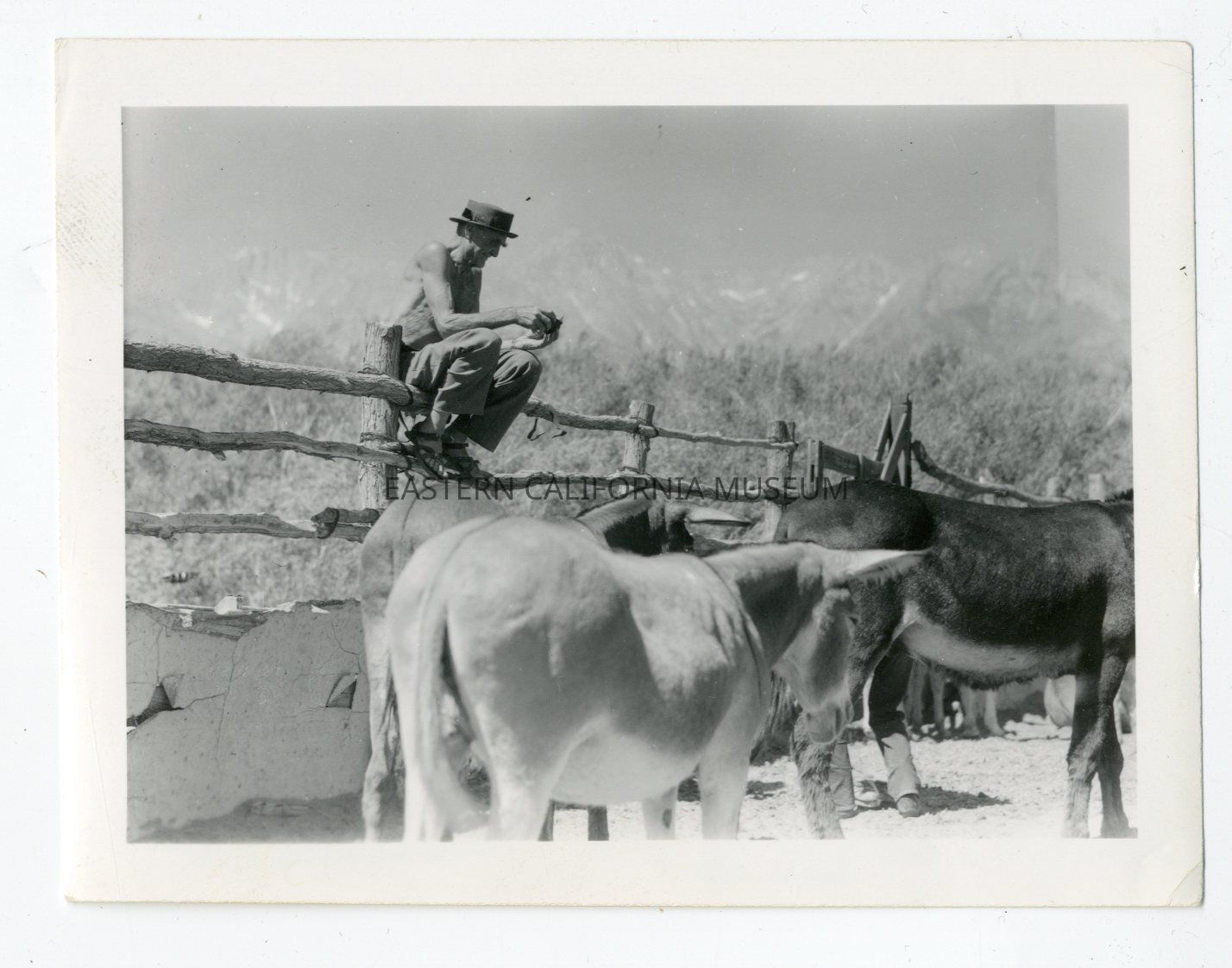 Photo of a man sitting on a wooden fence with mules or burros in the foreground and the Sierra Nevada mountain range in the background.