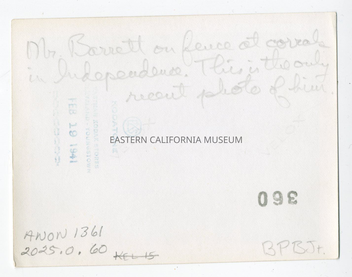 Written in pencil on reverse: Mr. Barrett on fence at corrals in Independence. This is the only recent photo of him. BPBJr.Photograph Details