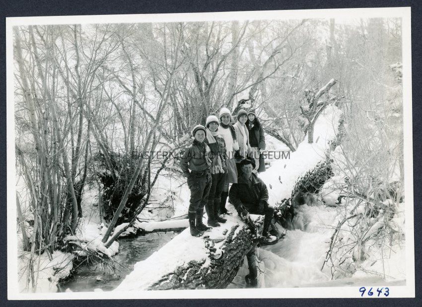 [No label, but it is described in the inventory as "People on log lots of snow."]